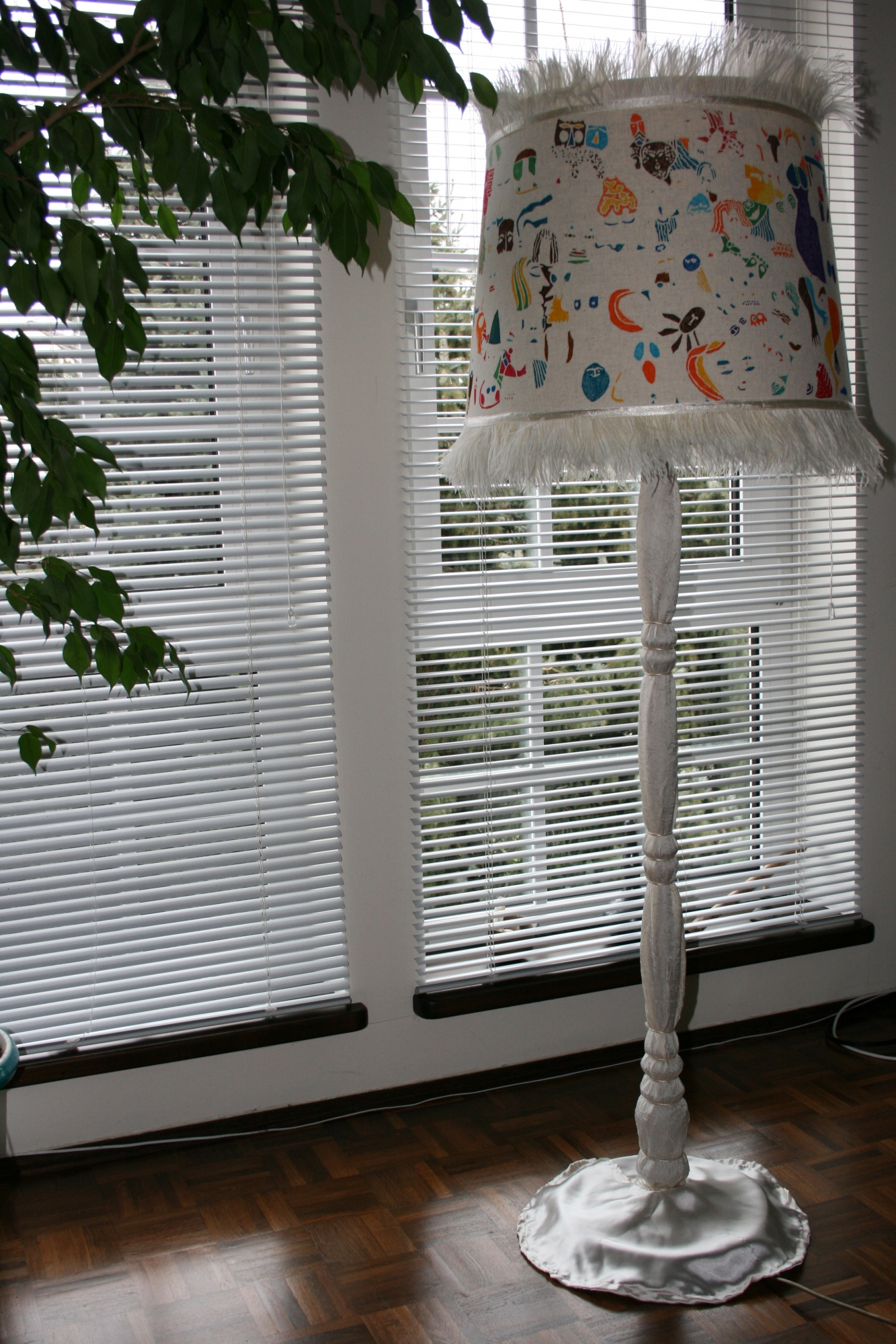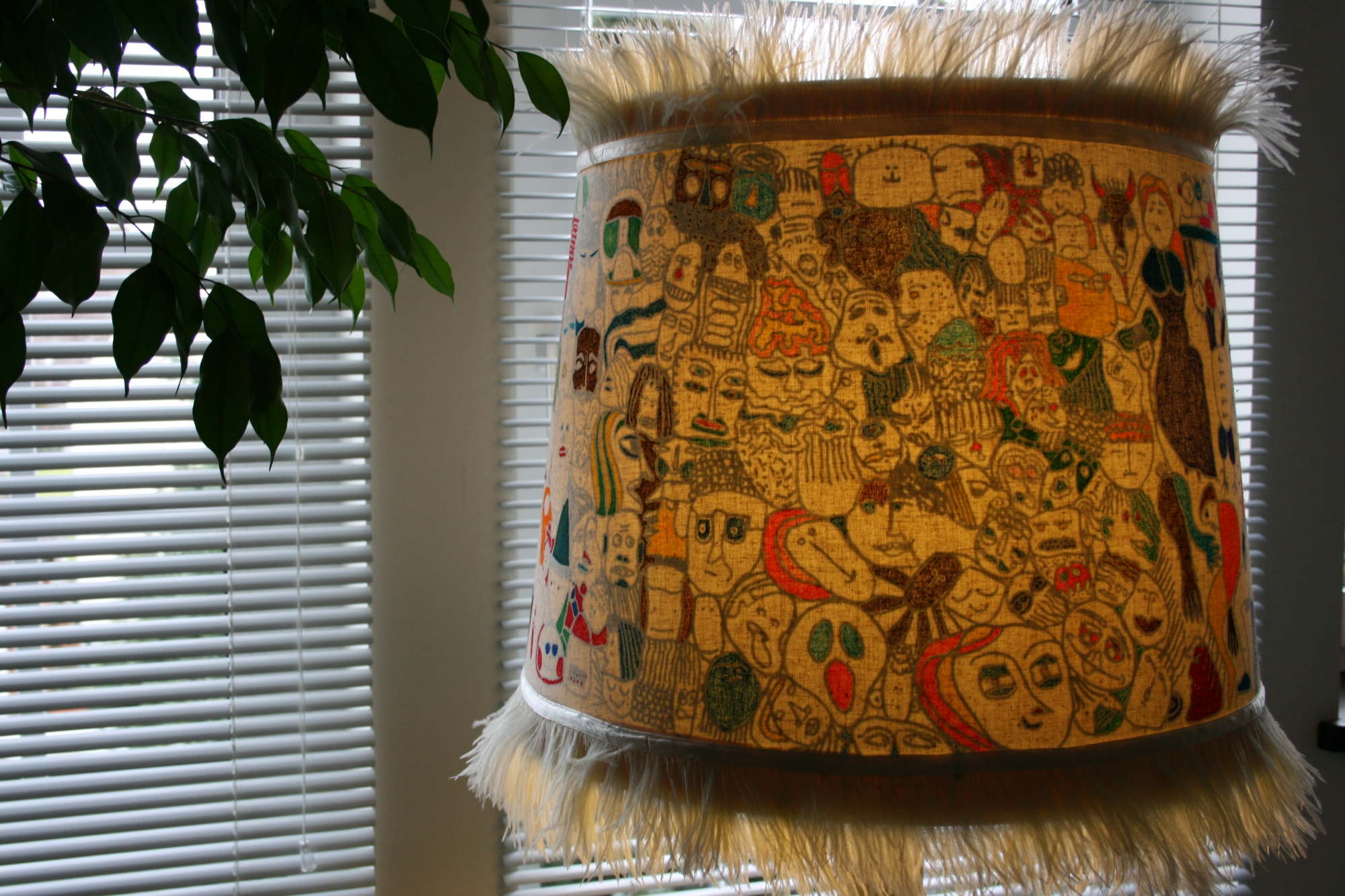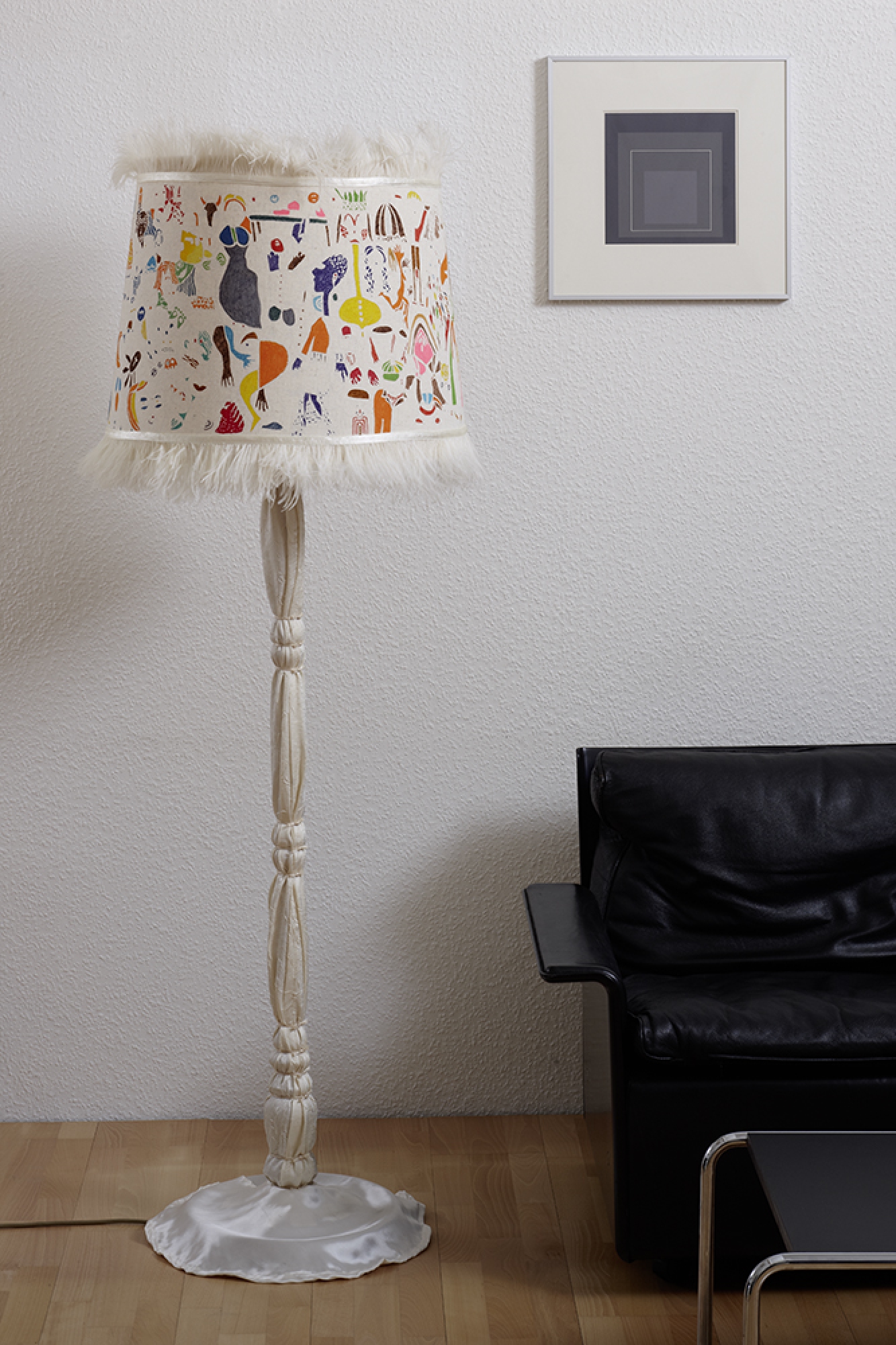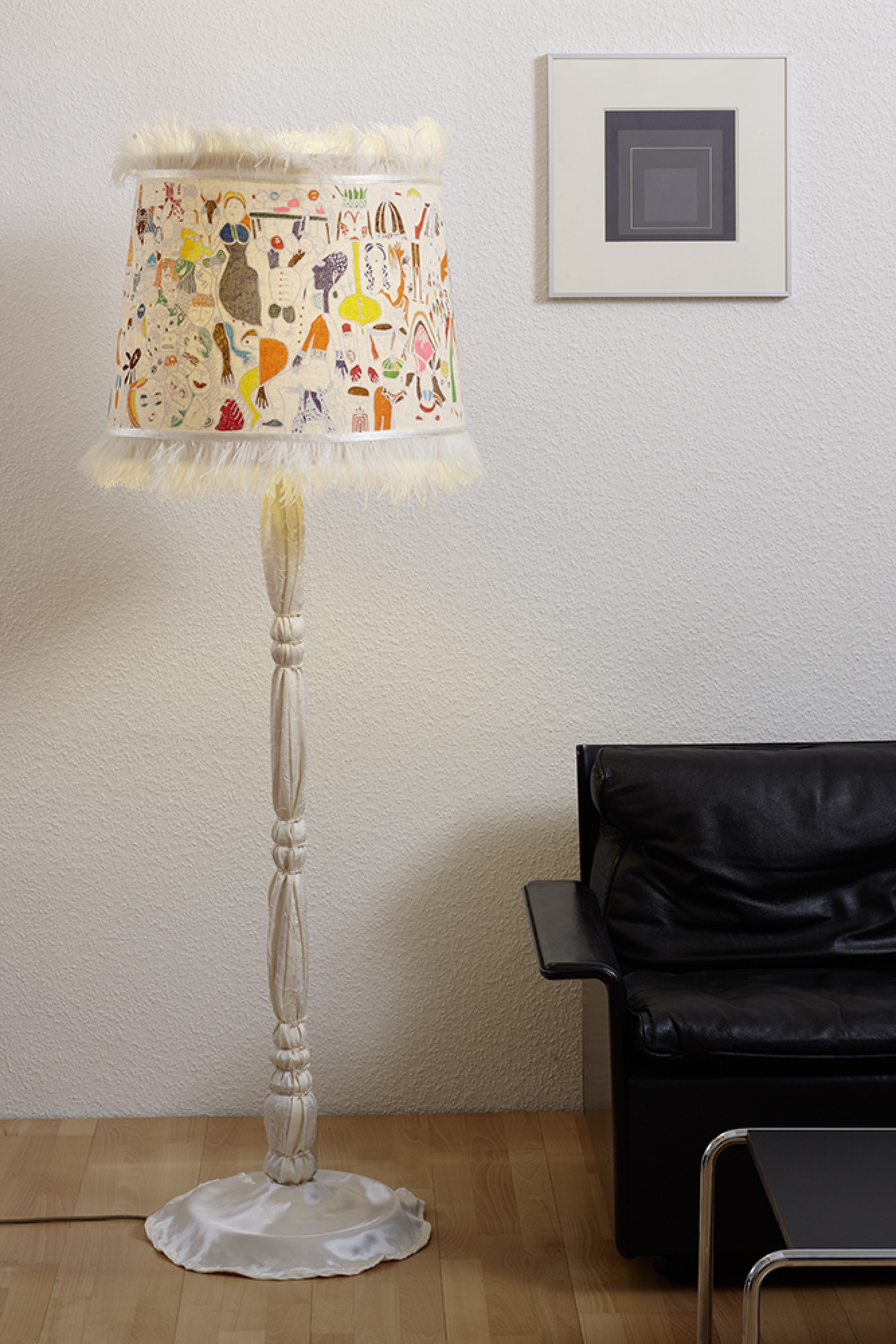 Material: Holz, Lampenschirmseide auf Hartfolie, Filzstiftmalfarbe, Federbordüre, Textilien