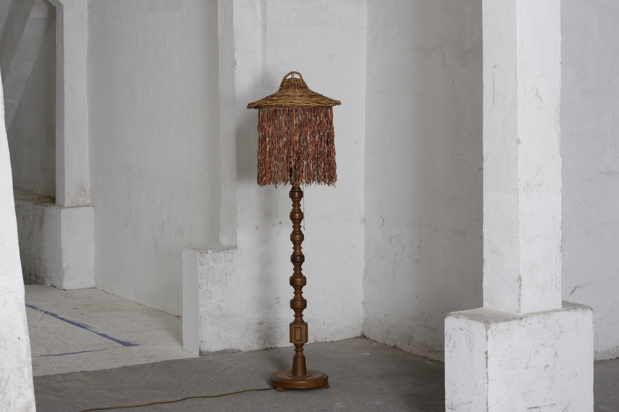Material: Weidengeflecht, Textilbänder, Energiesparlampen, Holzständer